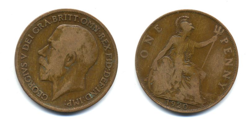 Великобритания 1 пенни 1920 Георг V (1910-1936) КМ 810, Spink 4051 бронза 47-333