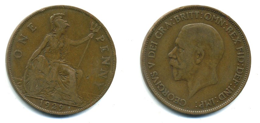 АНГЛИЯ 1 ПЕННИ 1929 ГЕОРГ V КМ 838, Spink 4055 бронза 41-953