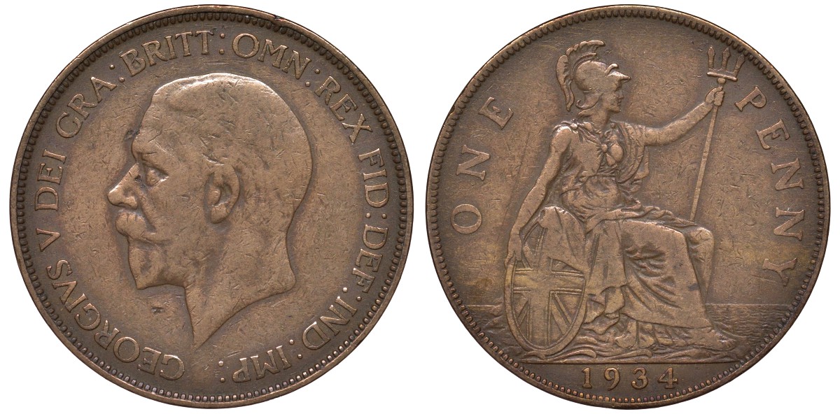 Великобритания 1 пенни 1934 Георг V (1910-1936) KM 838, Spink 4055 бронза 4131-423