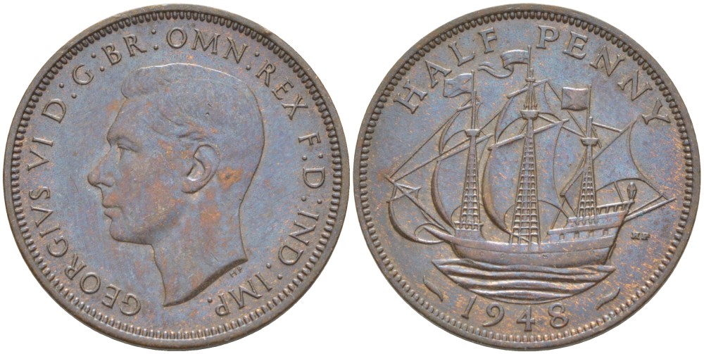Великобритания 1/2 пенни 1948 Георг VI (1936-1952) KM 844, Spink 4115 бронза 4610-146