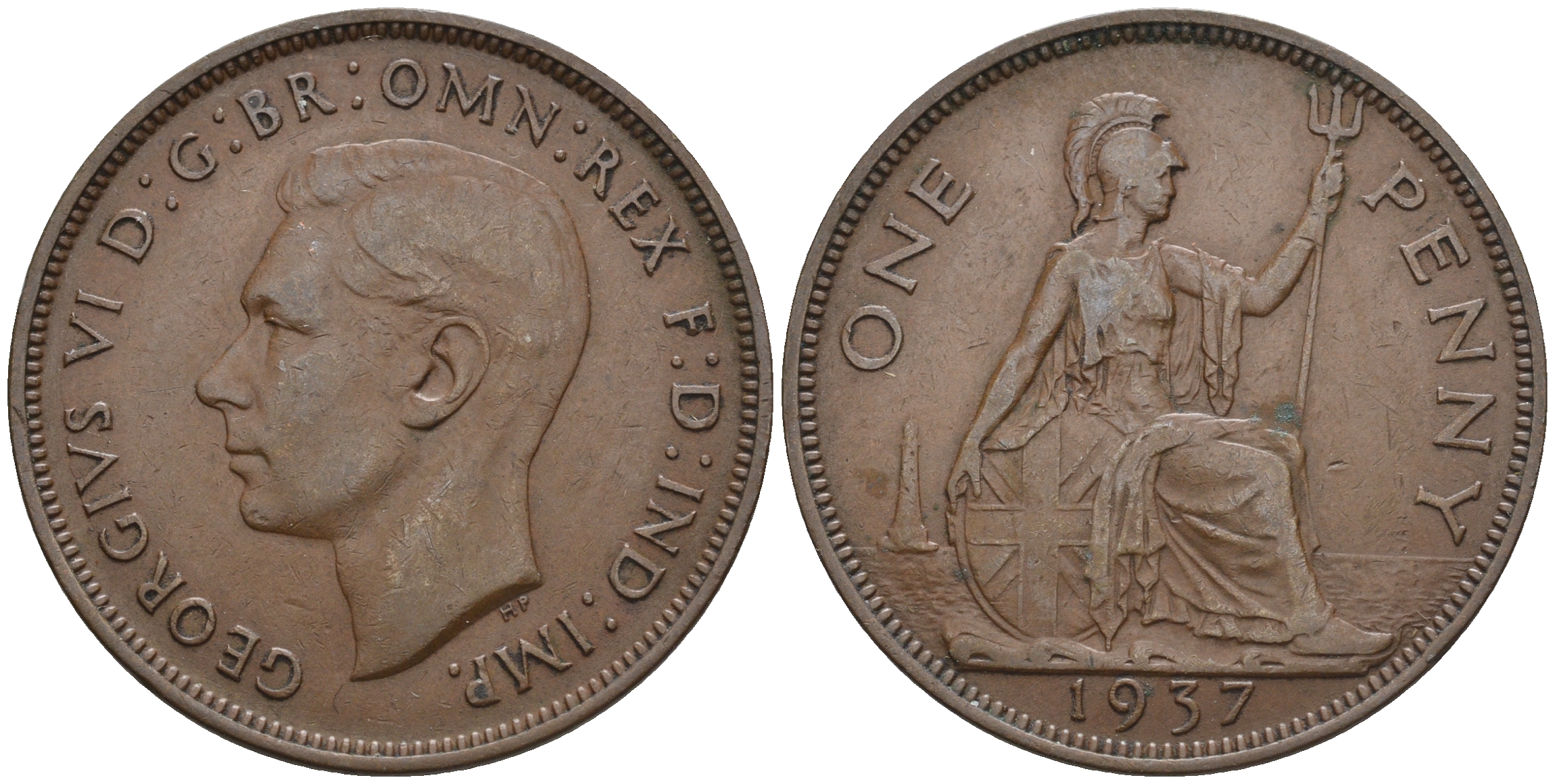 Великобритания 1 пенни 1937 Георг VI (1936-1952) KM 845, Spink 4114 бронза 4607-1115