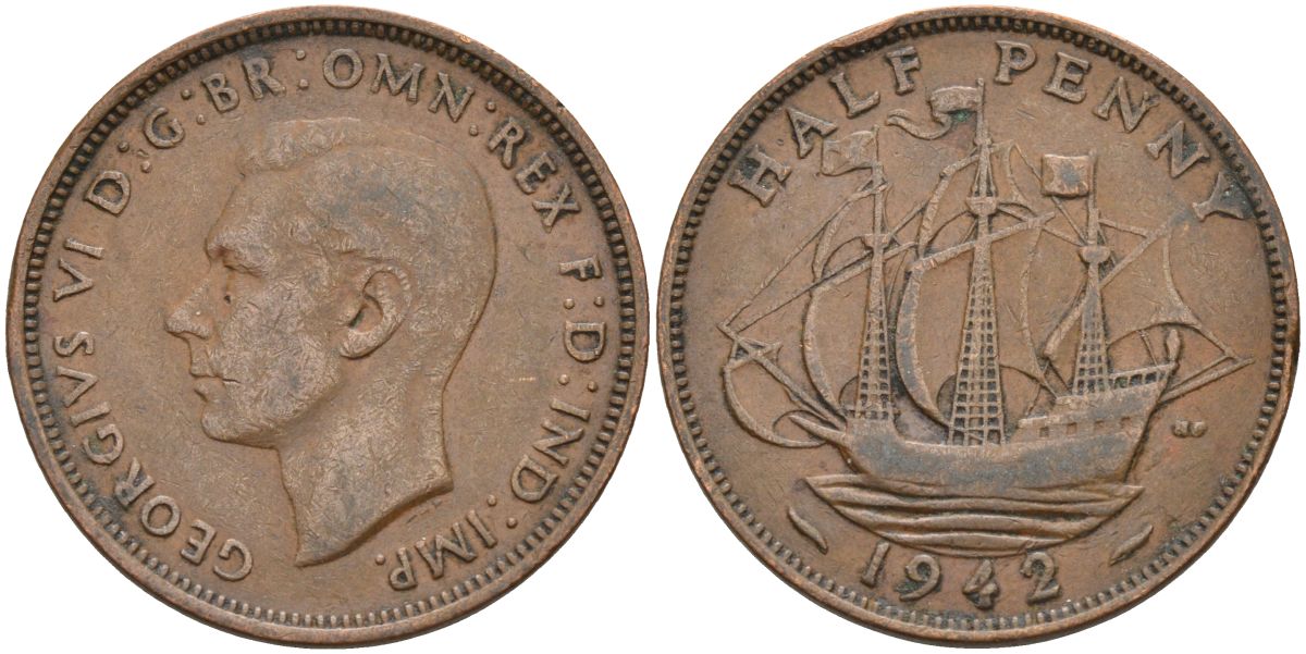 Великобритания 1/2 пенни 1942 Георг VI (1936-1952) KM 844, Spink 4115 бронза 4126-747