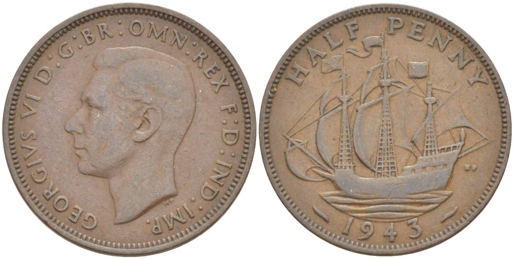 АНГЛИЯ 1/2 ПЕННИ 1943 ГЕОРГ VI (1936-1952) KM 844, Spink 4115 бронза 24-915
