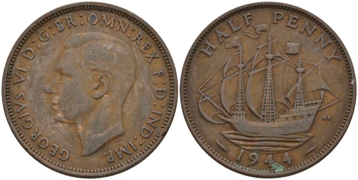 Великобритания 1/2 пенни 1944 Георг VI (1936-1952) KM 844, Spink 4115 бронза 4146-235