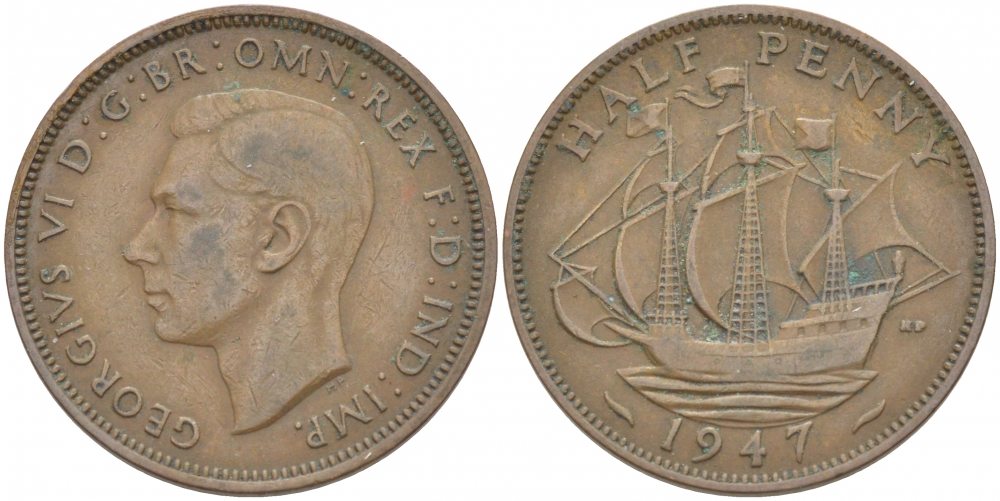 Великобритания 1/2 пенни 1947 Георг VI (1936-1952) KM 844, Spink 4115 KM 844 бронза 212-1223