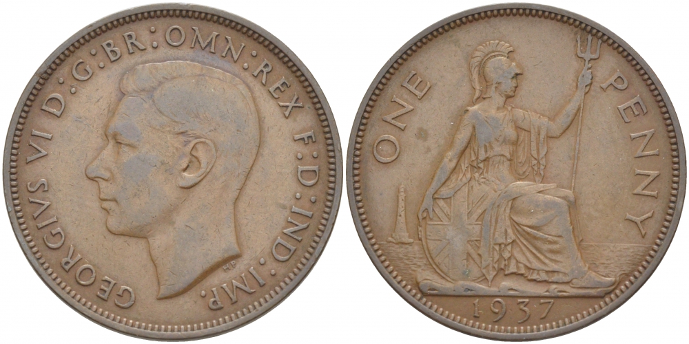 АНГЛИЯ 1 ПЕННИ 1937 ГЕОРГ VI KM 845, Spink 4114 бронза 3996-144