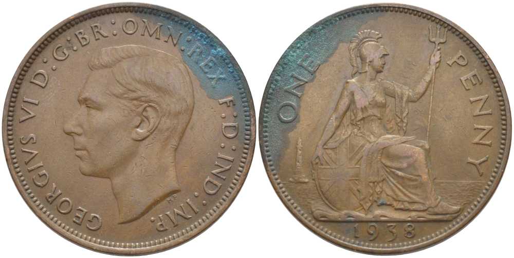 АНГЛИЯ 1 ПЕННИ 1938 ГЕОРГ VI (1937-1952) КМ 845, Spink 4114 бронза 115-335