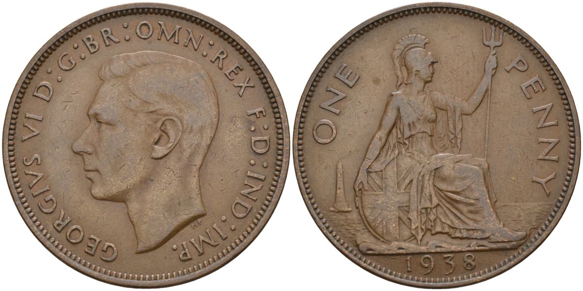 Великобритания 1 пенни 1938 Георг VI (1936-1952) KM 845, Spink 4114 бронза 4149-742