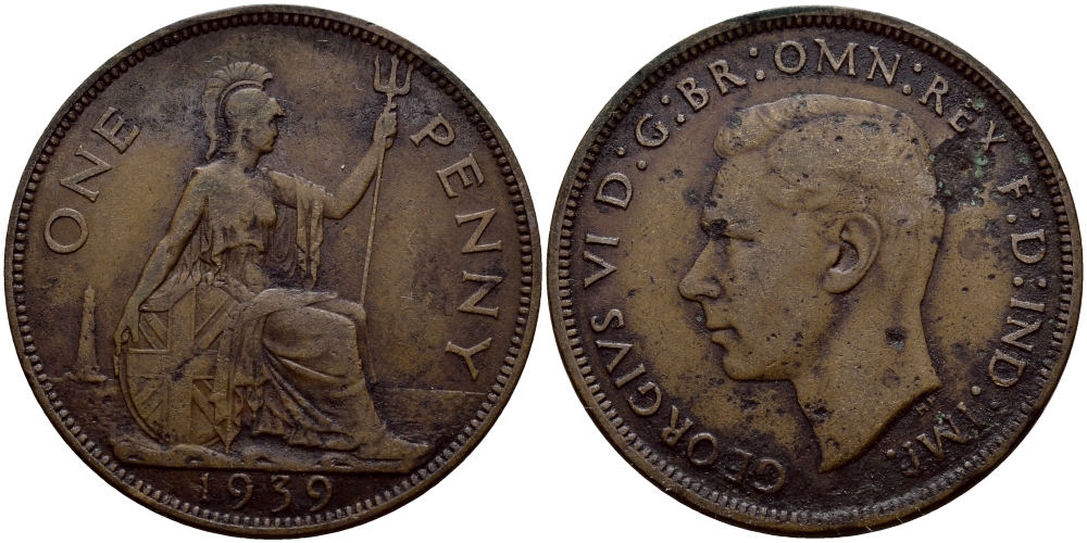 Великобритания 1 пенни 1939 Георг VI (1936-1952) KM 845, Spink 4114 бронза 540-511