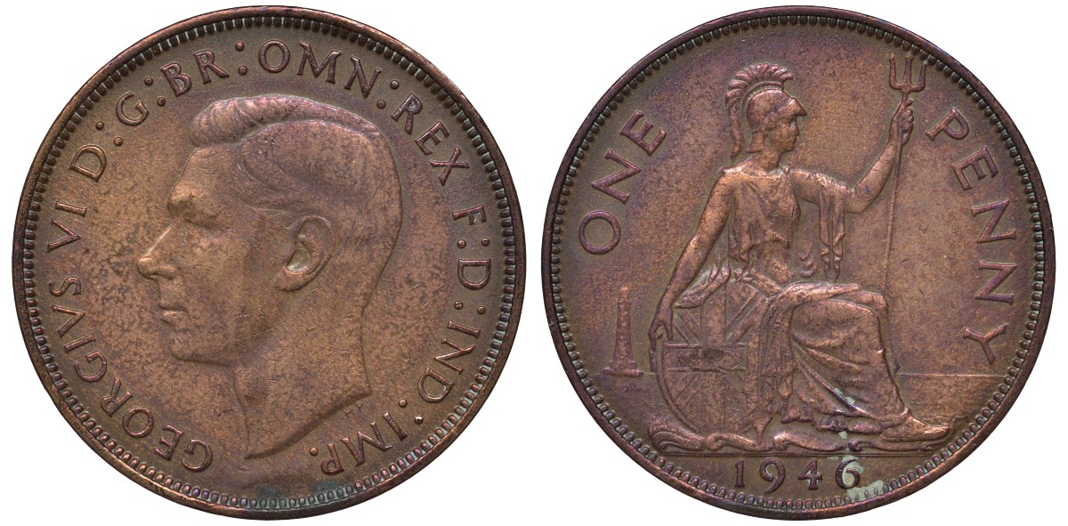 Великобритания 1 пенни 1946 Георг VI (1936-1952) KM 845, Spink 4114 бронза 4131-441