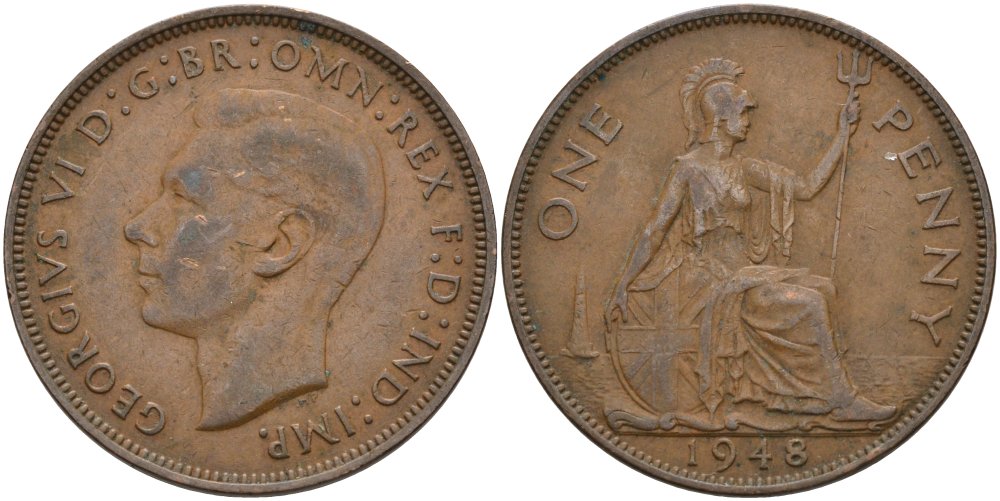 Великобритания 1 пенни 1948 Георг VI (1936-1952) KM 845, Spink 4114 бронза 4574-146