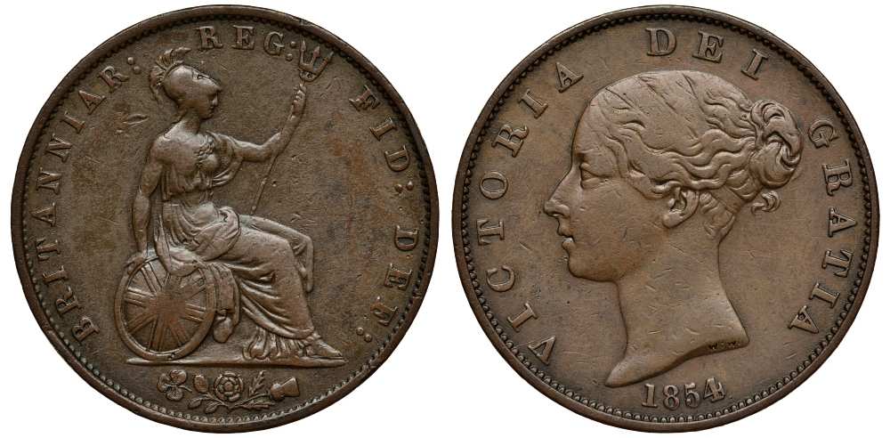 АНГЛИЯ 1/2 ПЕННИ 1854 ВИКТОРИЯ (1837-1901), ПЕРВЫЙ ПОРТРЕТ KM 726, Spink 3949 медь VF 1518-1621
