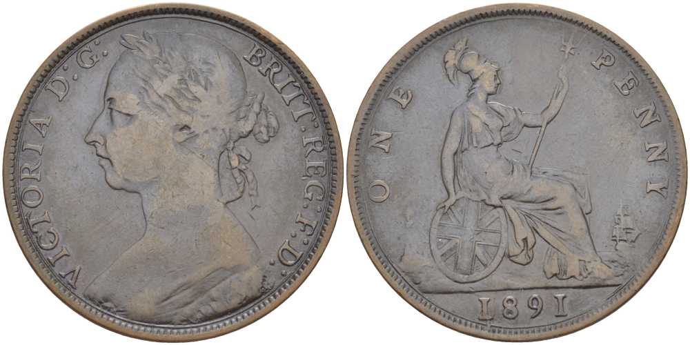 Великобритания 1 пенни 1891 Виктория (1837-1901) KM 755, Spink 3954 бронза 441-1141