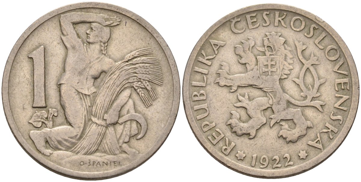 Чехословакия 1 крона 1922 женщина со снопом и серпом KM 4 медно-никель 4143-536