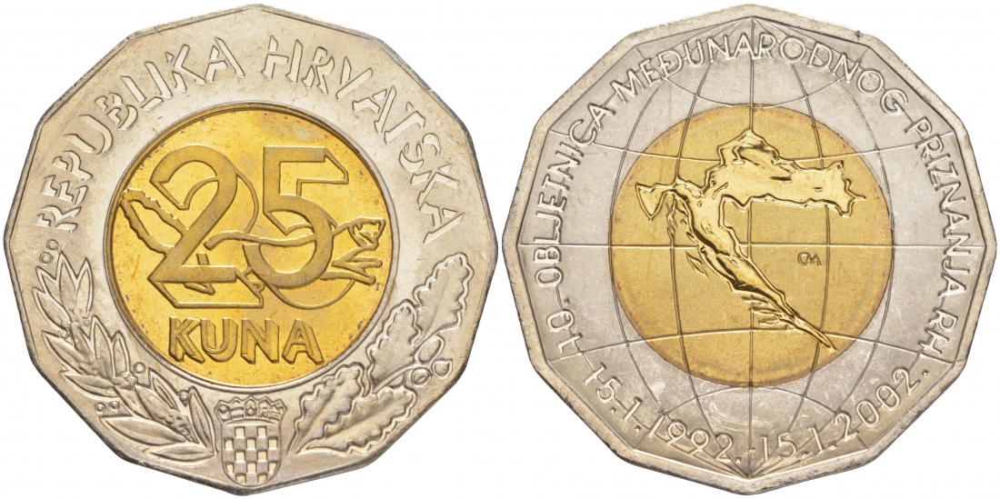 Хорватия 25 кун 2002 10 лет международного признания республики Хорватия KM 66 биметалл UNC M36-11