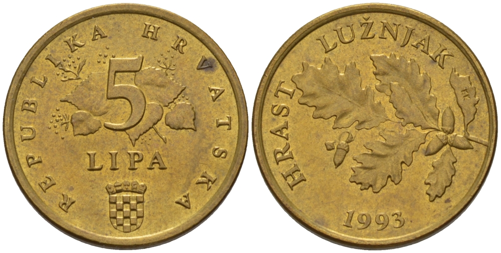Хорватия 5 лип 1993 дуб, легенда на хорватском KM 5 сталь плакированная латунью 66-517