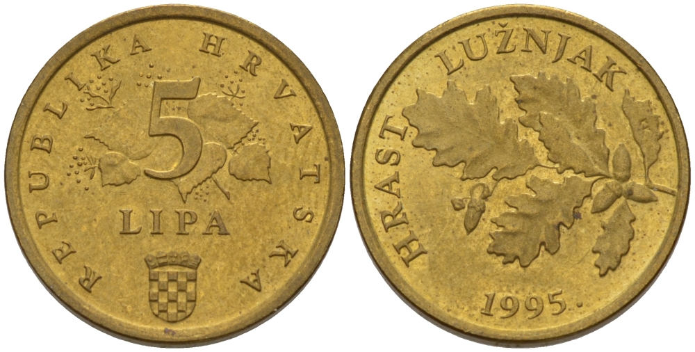 Хорватия 5 лип 1995 дуб, легенда на хорватском KM 5 сталь плакированная латунью 66-521