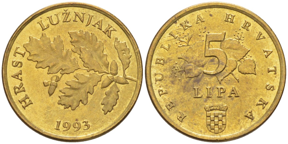 Хорватия 5 лип 1993 дуб, легенда на хорватском KM 5 сталь плакированная латунью 187-439