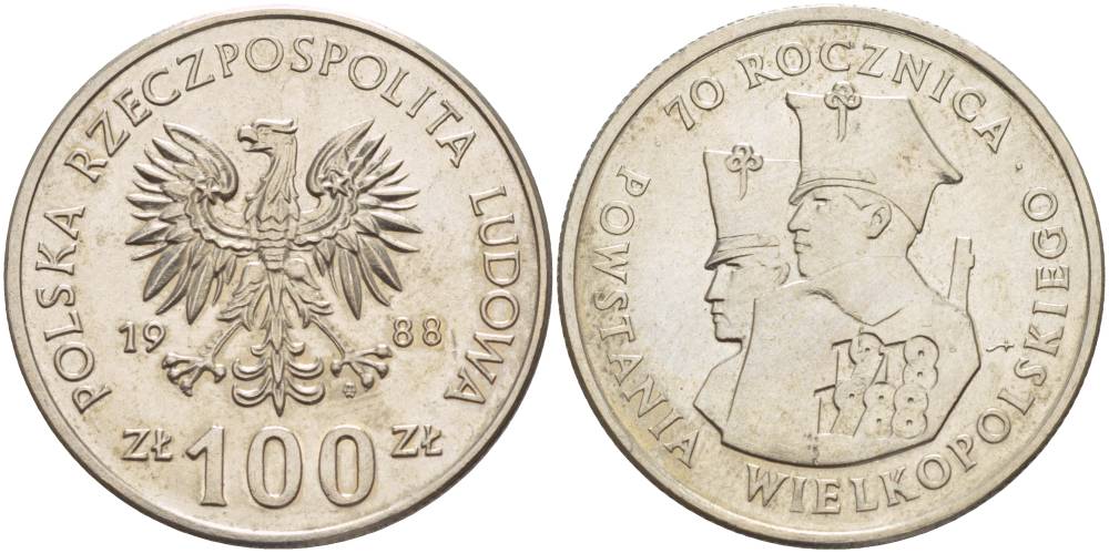 ПОЛЬША 100 ЗЛОТЫХ 1988 MW, 70 ЛЕТ ВЕЛИКОПОЛЬСКОГО ВОССТАНИЯ KM 182 медно-никель 4542-1031