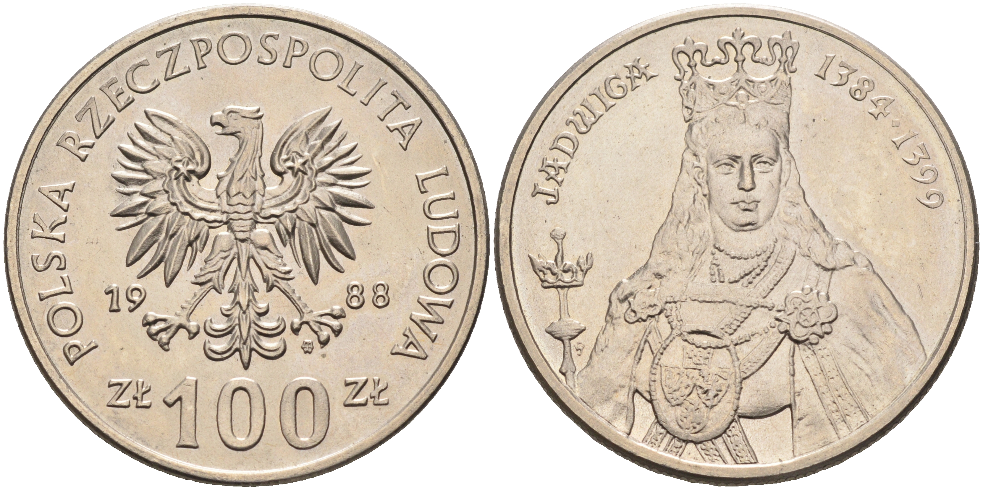 Польша 100 злотых 1988 MW, серия Польские правители, королева Ядвига (1384-1399) KM 183 медно-никель UNC 4149-244