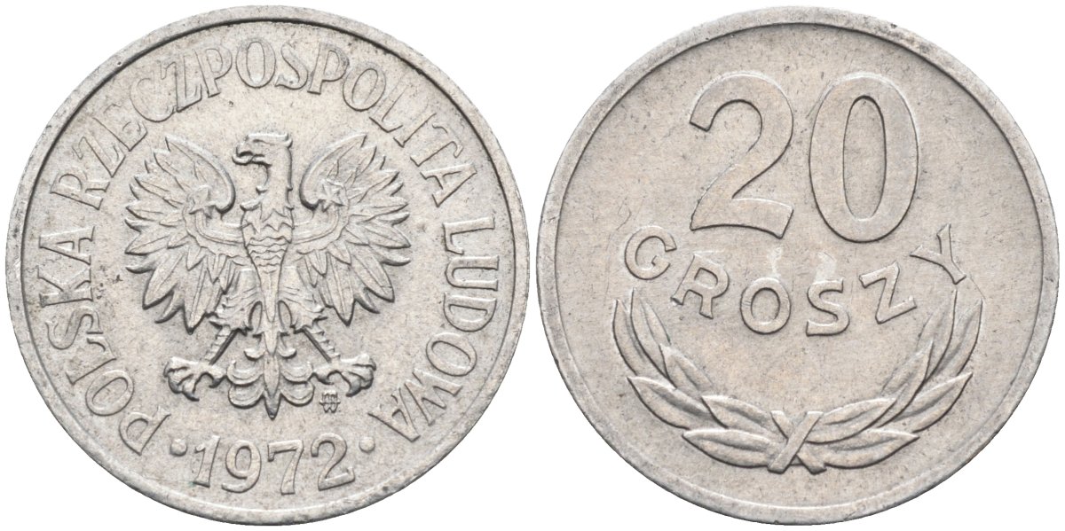 Польша 20 грошей 1972 MW, Народная Республика KM А47, Parchimowicz 208l алюминий 4580-649
