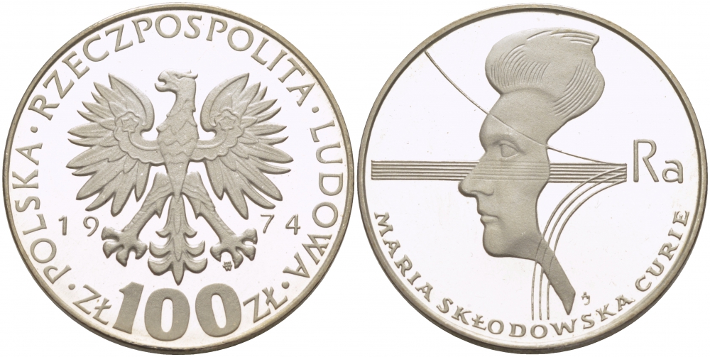 Польша 100 злотых 1974 MW, 40 лет со дня смерти Марии Склодовской-Кюри (1867-1934) KM 71, Parchimowicz 270 серебро PROOF 06-271-45