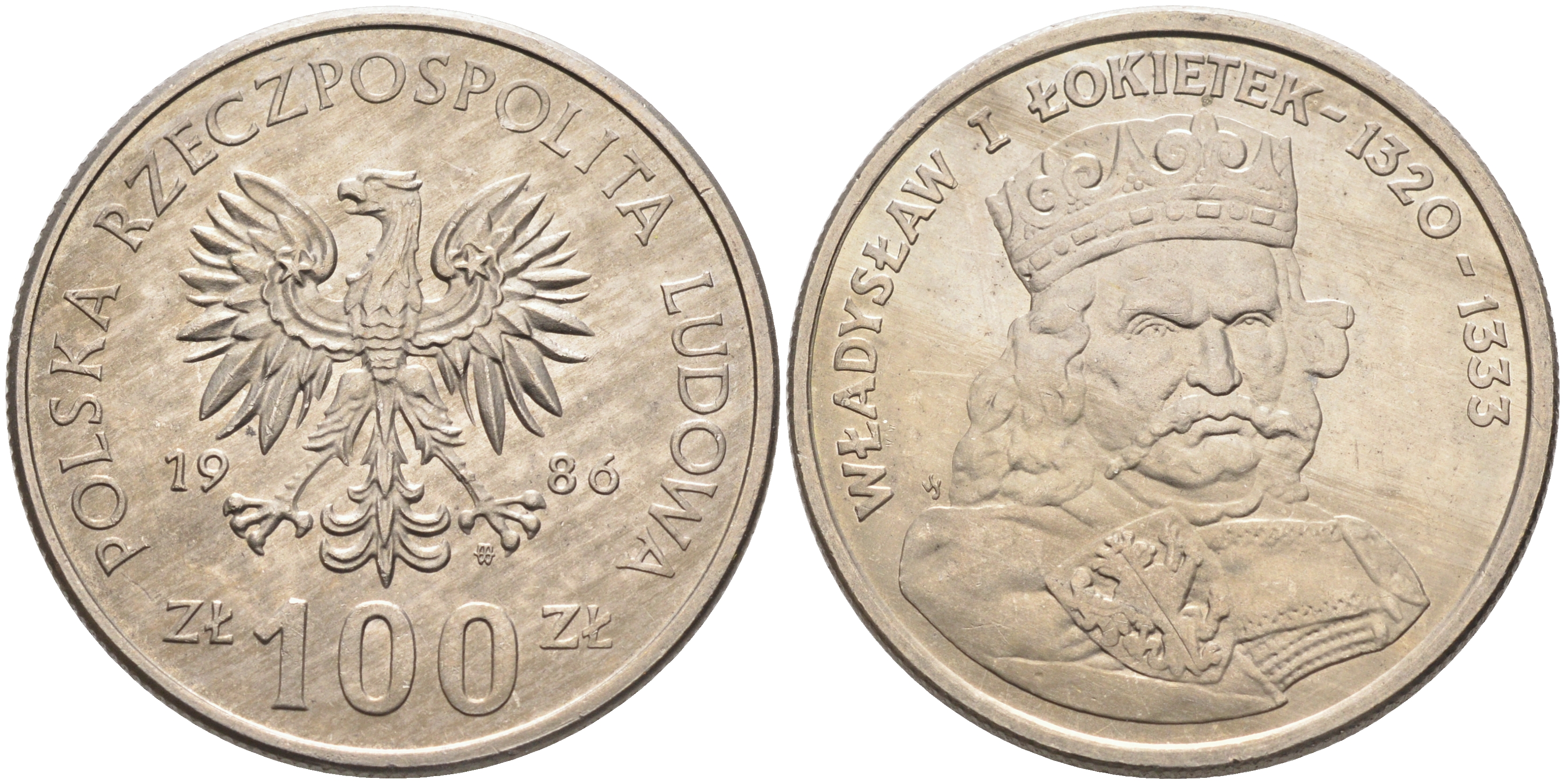 Польша 100 злотых 1986 MW, серия польские правители, Владислав I локоток (1320-1333) KM 160, Parchimowicz 413b медно-никель 4590-513