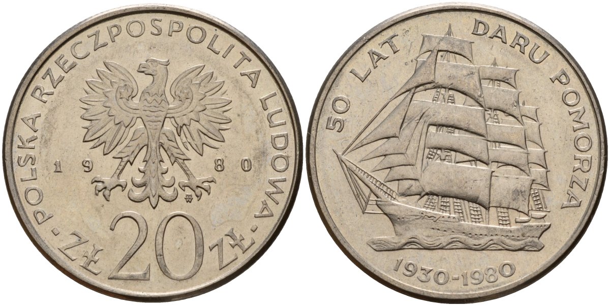 Польша 20 злотых 1980 MW, 50 лет фрегату «Дар Поморья» Y 112 медно-никель 4157-1015
