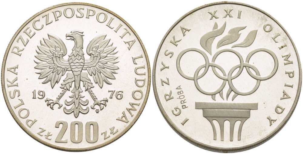 Польша 200 злотых 1976 MW, XXI олимпийские игры 1976 года в Монреале, олимпийский огонь и кольца, PROBE, пробный выпуск, тираж 6048 экз., в оригинальной пластиковой коробке KM Pr285 серебро PROOF 5-3-1-164