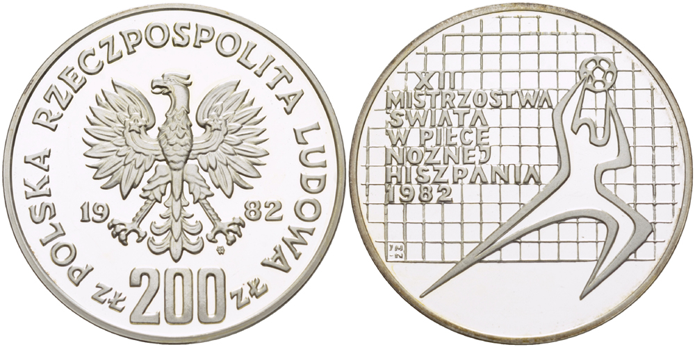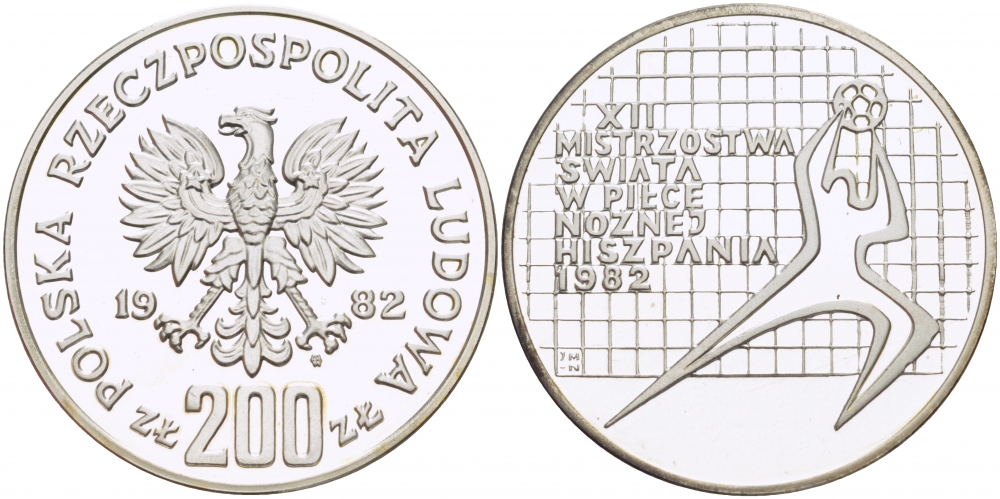 Польша 200 злотых 1982 MW, XII чемпионат мира по футболу в Испании 1982 года, тираж 21000 экземпляров, KM 130, Parchimowicz 314 серебро PROOF 1085-1-62