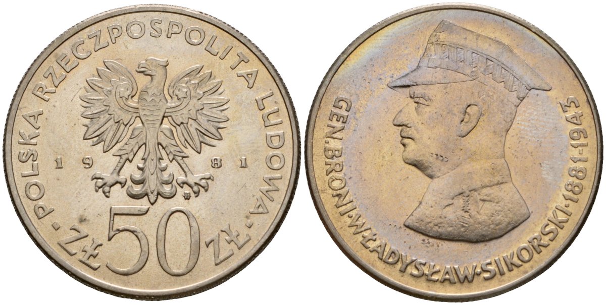 Польша 50 злотых 1981 MW, Военачальники Второй мировой войны - Владислав Сикорский Y 122 медно-никель UNC 81-636