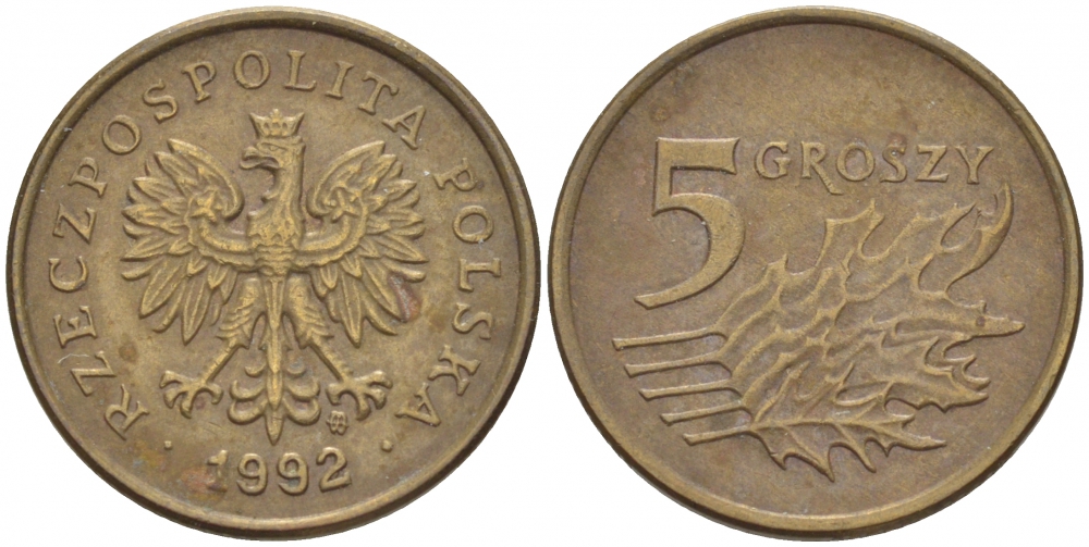 ПОЛЬША 5 ГРОШЕЙ 1992 MW KM 278 латунь 214-758