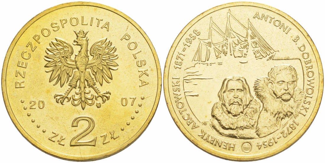 ПОЛЬША 2 ЗЛОТЫХ 2007 ГЕНРИК АРЦТОВСКИЙ И АНТОНИ БОЛЕСЛАВ ДОБРОВОЛЬСКИЙ, СЕРИЯ ПОЛЬСКИЕ ПУТЕШЕСТВЕННИКИ KM 610 латунь UNC M19-16