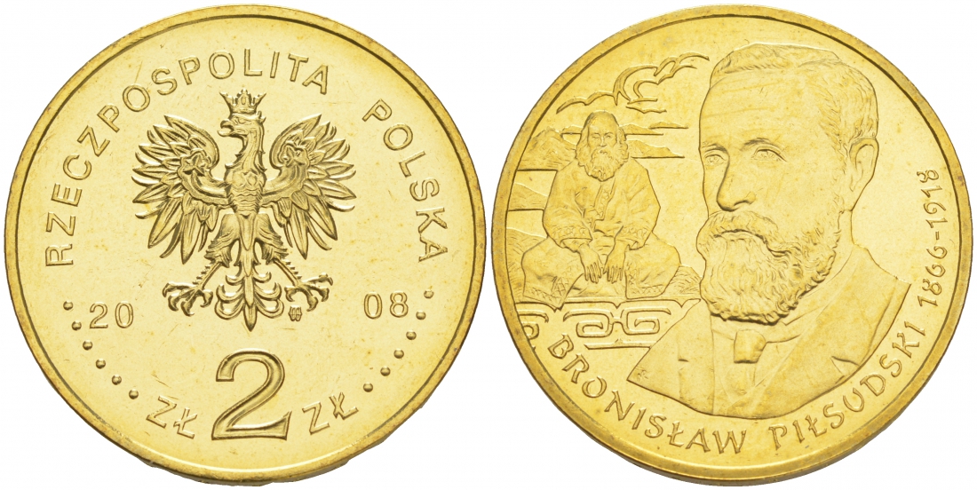 ПОЛЬША 2 ЗЛОТЫХ 2008 БРОНИСЛАВ ПИЛСУДСКИЙ (1866-1918), СЕРИЯ ПОЛЬСКИЕ ПУТЕШЕСТВЕННИКИ KM 648 латунь UNC M19-11