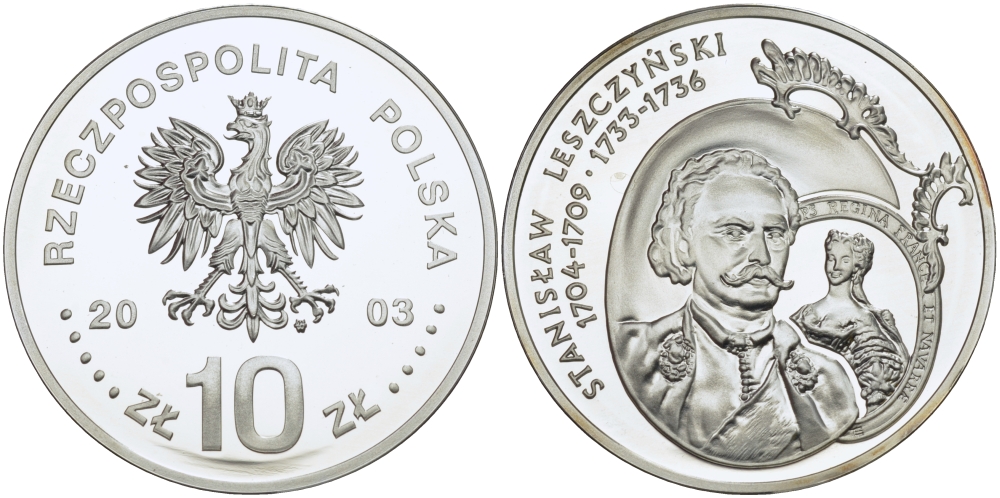 ПОЛЬША 10 ЗЛОТЫХ 2003 MW, КОРОЛЬ ПОЛЬСКИЙ И ВЕЛИКИЙ КНЯЗЬ ЛИТОВСКИЙ СТАНИСЛАВ ЛЕЩИНСКИЙ (1704-1709) (1733-1736), ПРОБА 925, ВЕС 14,14 ГР., ТИРАЖ 40000 ЭКЗ., ДИАМЕТР 32 ММ. KM 475 серебро PROOF 1080-9-55
