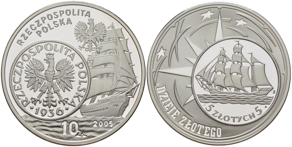 Польша 10 злотых 2005 MW, происхождение злотого, 5 злотых 1936, парусник, порт Гданьска KM 568 серебро PROOF 1074-8-62