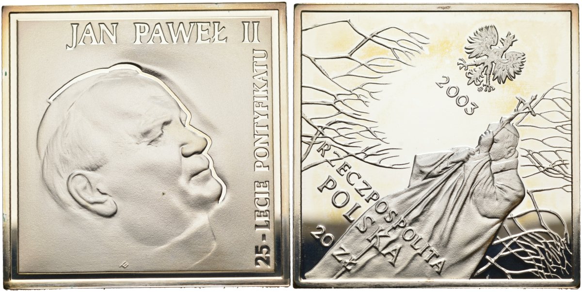 Польша 20 злотых 2003 MW, 25 лет Пантификата, Иоанн Павел II, размер 40Х40 мм., в пластике KM 471 серебро PROOF 05-139-23
