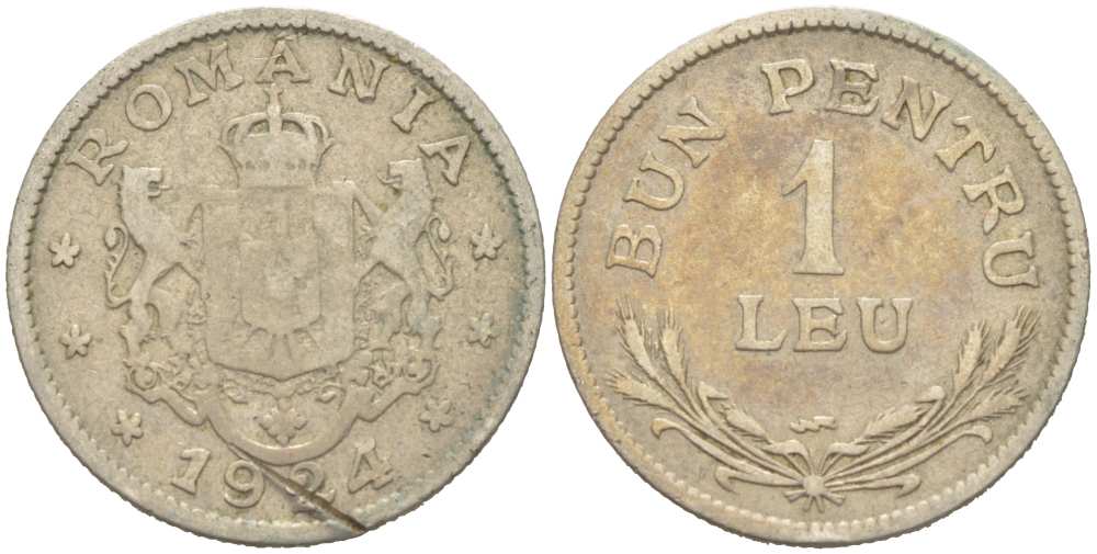 Румыния 1 лей 1924 Фердинанд I (1914-1927) KM 46 медно-никель 217-141