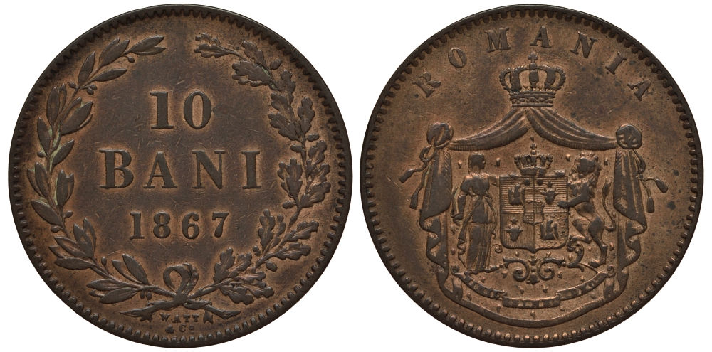 РУМЫНИЯ 10 БАНИ 1867 WATT & CO, КАРОЛЬ I (1881-1914) KM 4.2 медь 441-224