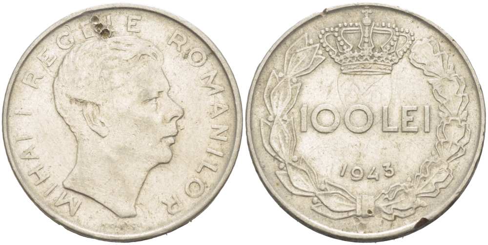 РУМЫНИЯ 100 ЛЕЙ 1943 МИХАЙ I (1927-1930) KM 64 сталь плакированная никелем 215-536