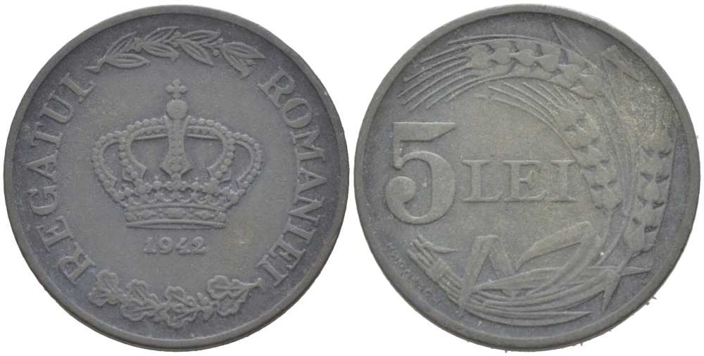 РУМЫНИЯ 5 ЛЕЙ 1942 МИХАЙ I (1940-1947), ВТОРАЯ МИРОВАЯ ВОЙНА KM 61 цинк 217-147