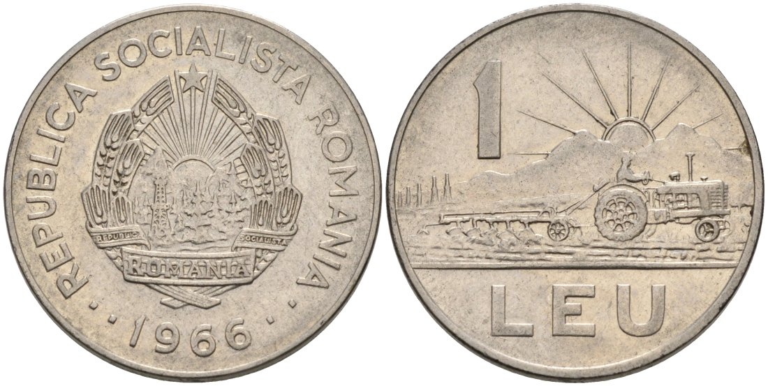 Румыния 1 лей 1966 ТРАКТОР KM 95 сталь плакированная никелем 4571-555