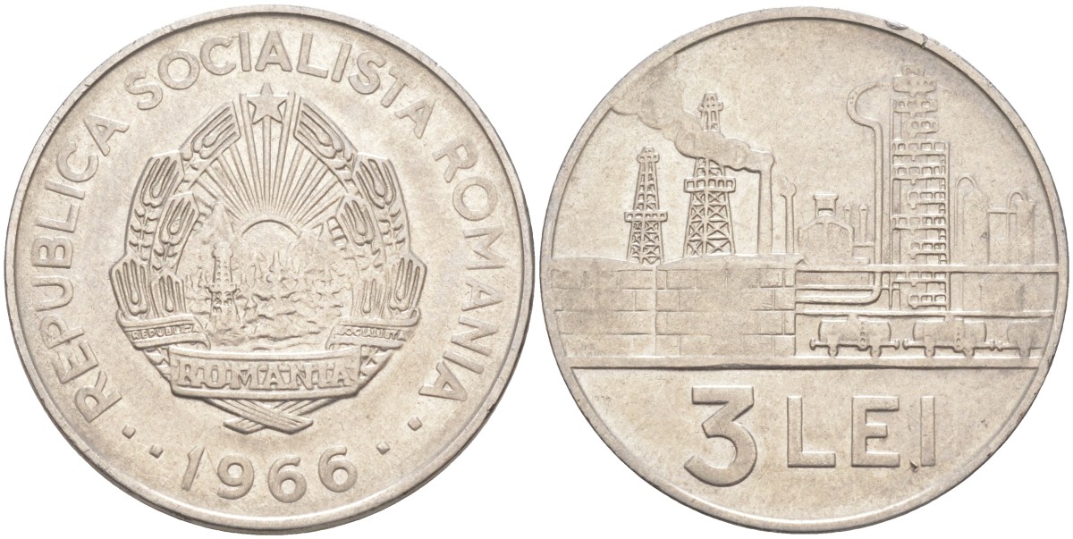 Румыния 3 лея 1966 нефтеперегонный завод KM 96 сталь плакированная никелем 4529-843