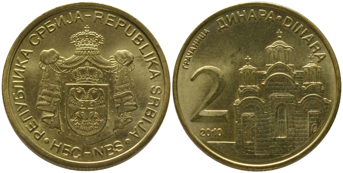 Сербия 2 динара 2010 KM 46 никель латунь aUNC 4546-645