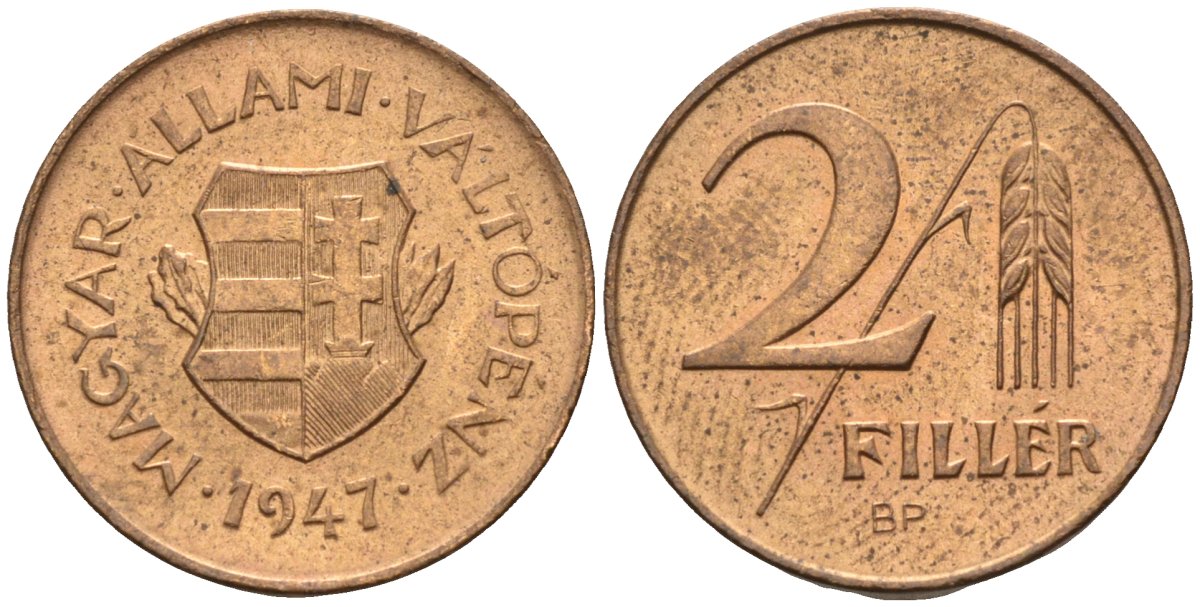 Венгрия 2 филлера 1947 ВР, первая республика (1946-1948) KM 529 латунь aUNC 4585-223
