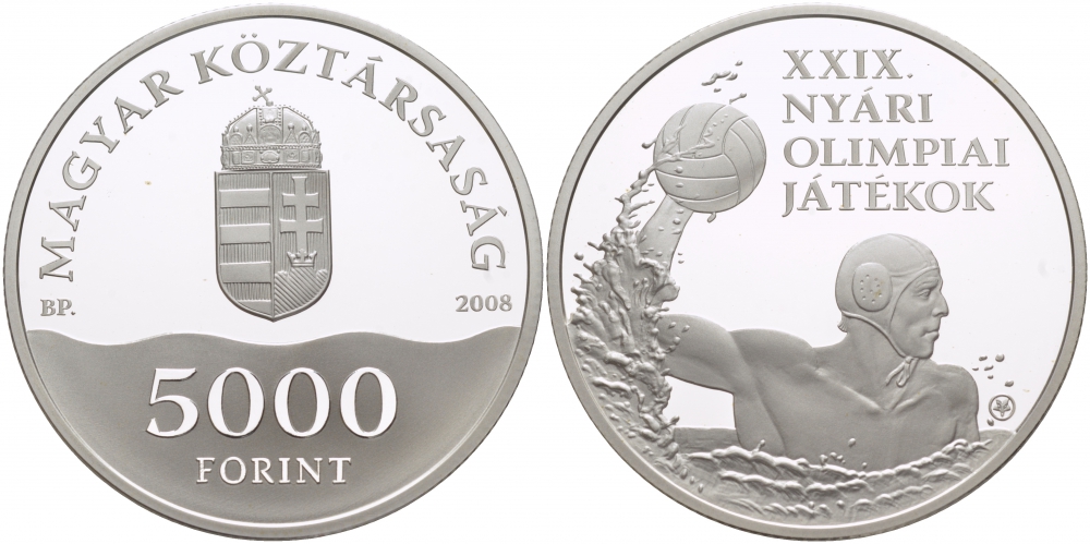 Венгрия 5000 форинтов 2008 Олимпийские игры, водное поло, тираж 14000 экземпляров KM 808 серебро PROOF 1074-6-21
