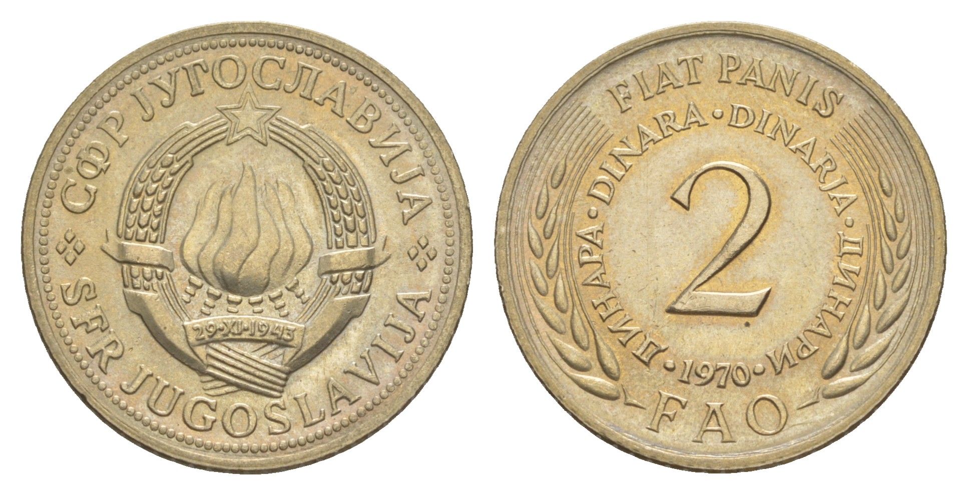 Югославия 2 динара 1970 Продовольственная программа - ФАО KM 55 медь цинк никель UNC 4543-1151
