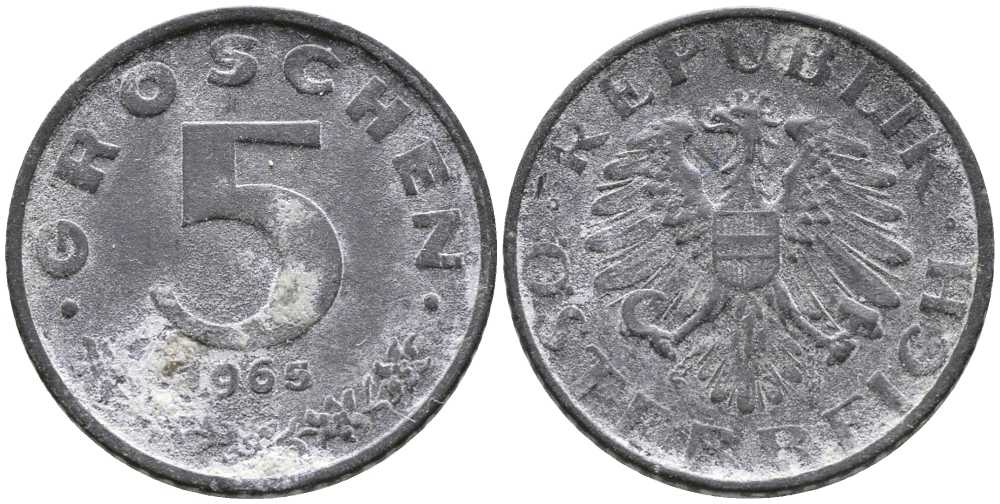 АВСТРИЯ 5 ГРОШЕЙ 1965 KM 2875 цинк 112-667