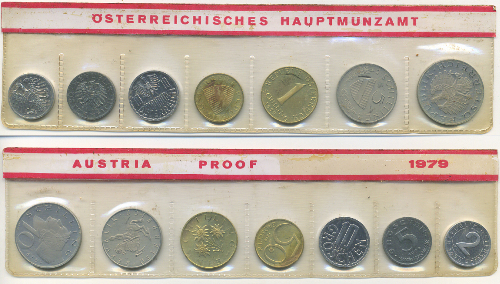 Австрия набор из 7 монет 1979 2, 5, 10, 50 грошей, 1, 5, 10 шиллингов, в целлофане KM PS 39 PROOF 4400-5-1