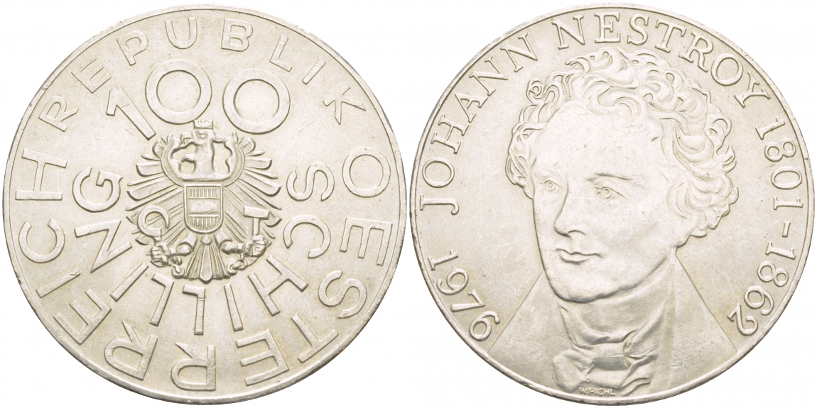 Австрия 100 шиллингов 1976 175 лет со дня рождения Иоганна Нестрои? KM 3932 серебро 443-341
